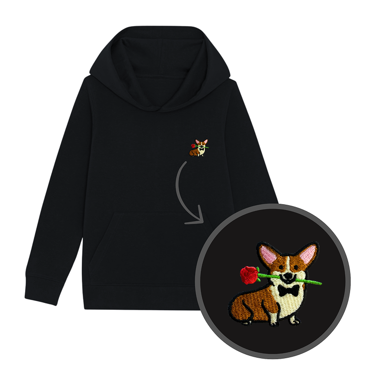 Bluza dziecięca z haftowanym corgim trzymającym różę - taki sam model, jak bluzy dla dorosłych (w bluzach dla dzieci brak sznurka pod szyją).