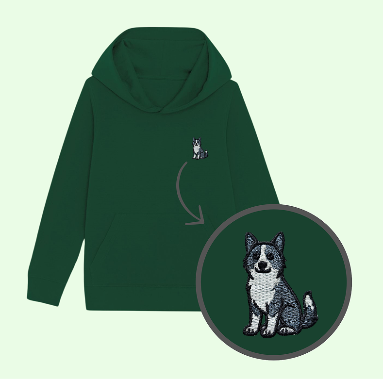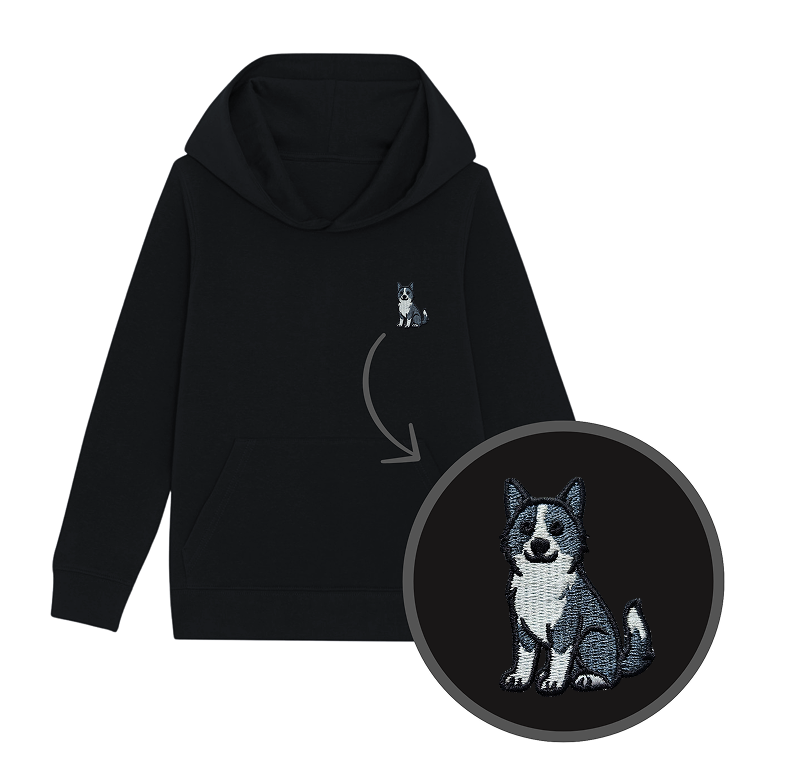 Bluza dziecięca z haftowanym pieskiem rasy KARELSKI NA NIEDŹWIEDZIE - taki sam model, jak bluzy dla dorosłych (w bluzach dla dzieci brak sznurka pod szyją).