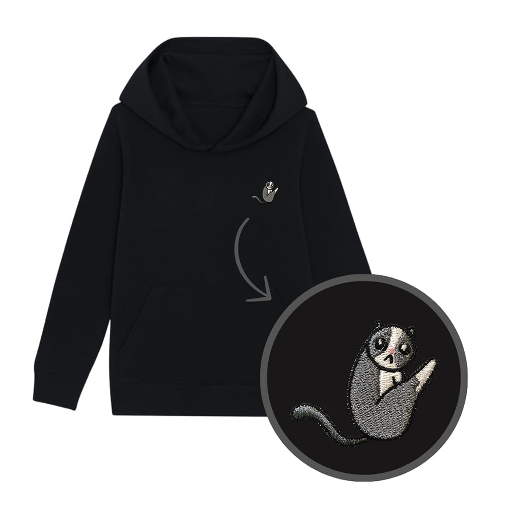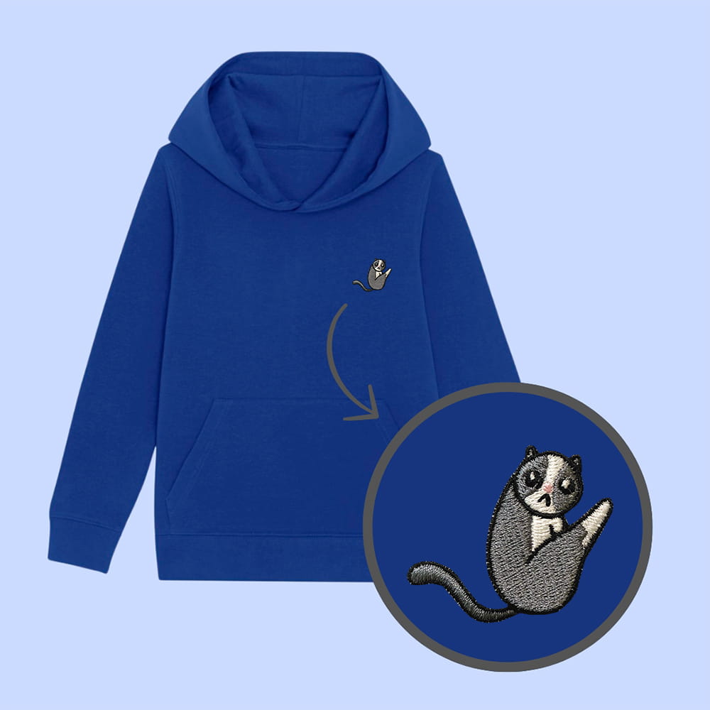 Bluza dziecięca z haftowanym kotkiem w uroczej odsłonie myjącego się kotka - taki sam model, jak bluzy dla dorosłych (w bluzach dla dzieci brak sznurka pod szyją).