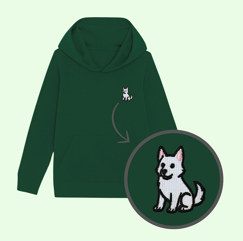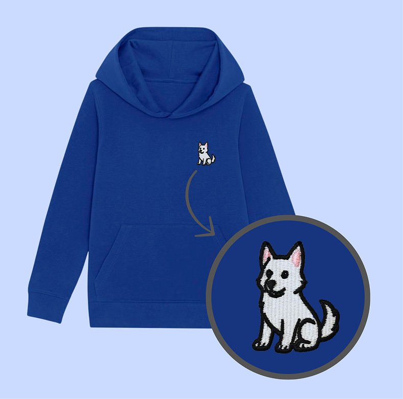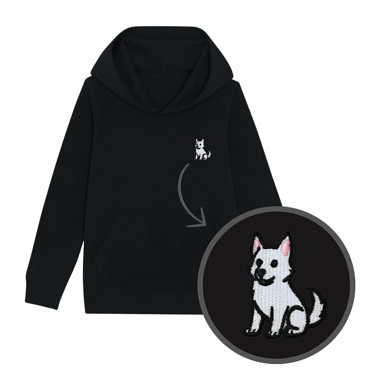 Bluza dziecięca z wyhaftowanym owczarkiem szwajcarskim - taki sam model, jak bluzy dla dorosłych (w bluzach dla dzieci brak sznurka pod szyją).