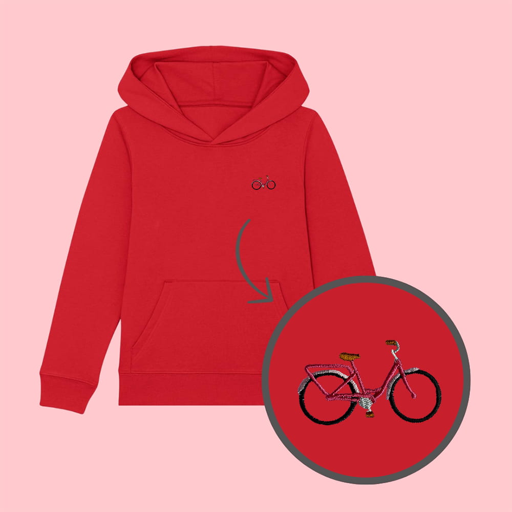 Bluza dziecięca z haftowanym rowerem w wersji damskiej - taki sam model, jak bluzy dla dorosłych (w bluzach dla dzieci brak sznurka pod szyją).