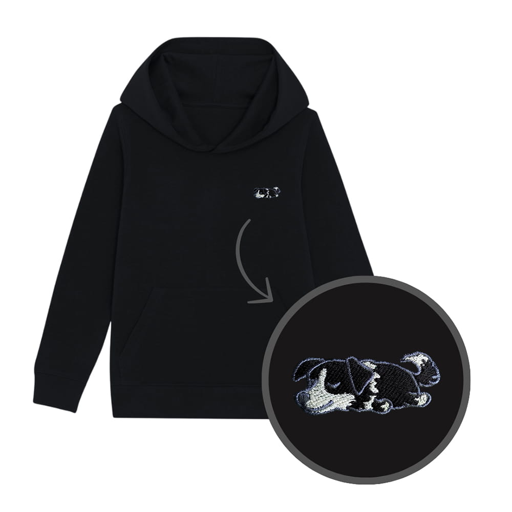 Bluza dziecięca z haftowanym border collie (w umaszczeniu czarnym) - taki sam model, jak bluzy dla dorosłych (w bluzach dla dzieci brak sznurka pod szyją).