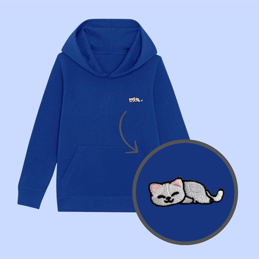 Bluza dziecięca z haftowanym kotkiem w wersji śpiącej - taki sam model, jak bluzy dla dorosłych (w bluzach dla dzieci brak sznurka pod szyją).