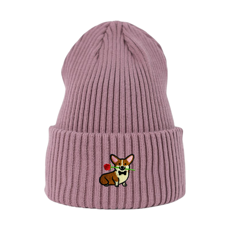 Haftowana czapka beanie - CORGI Z RÓŻĄ