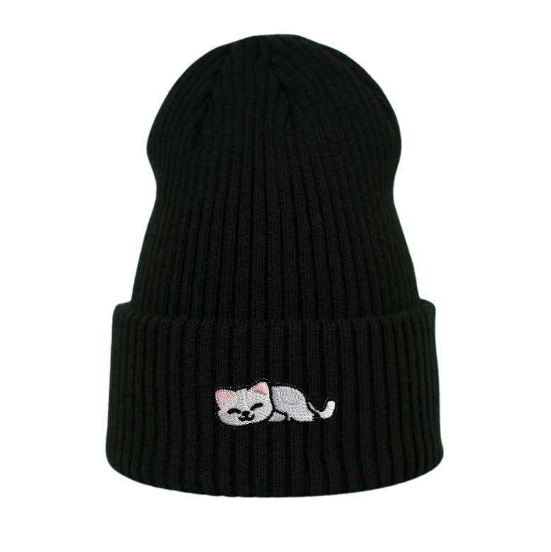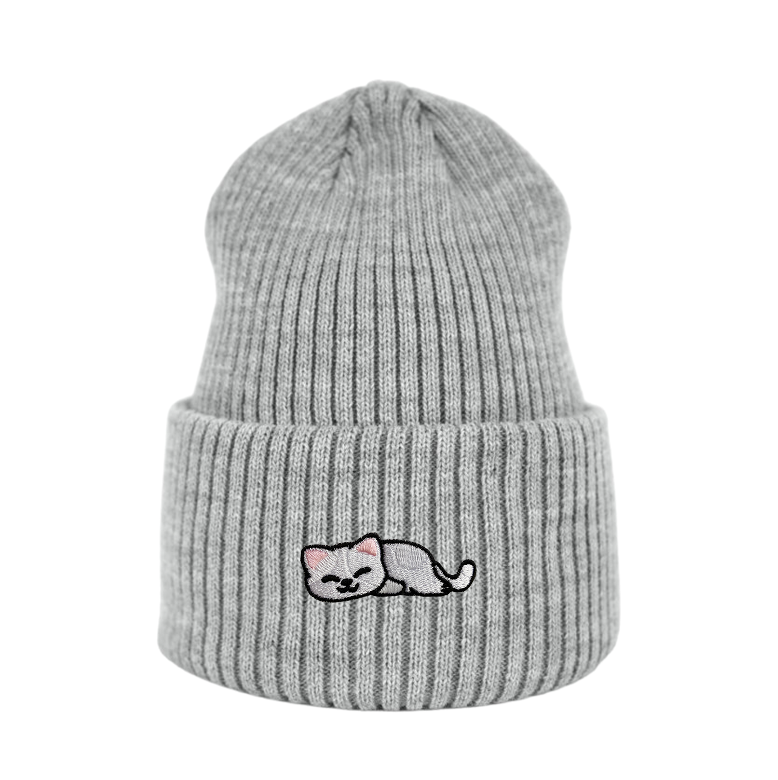 Haftowana czapka beanie - ŚPIĄCY KOTEK BIAŁY