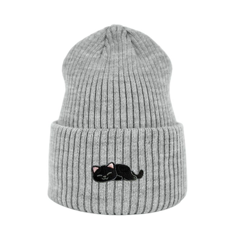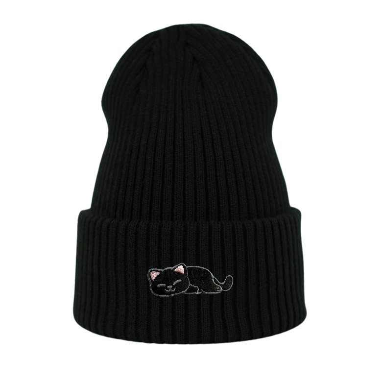 Haftowana czapka beanie - ŚPIĄCY KOTEK CZARNY