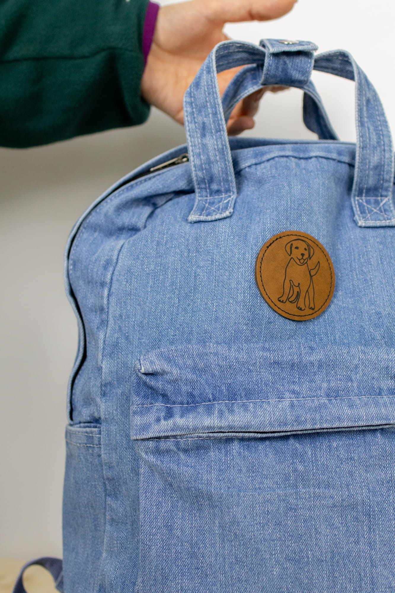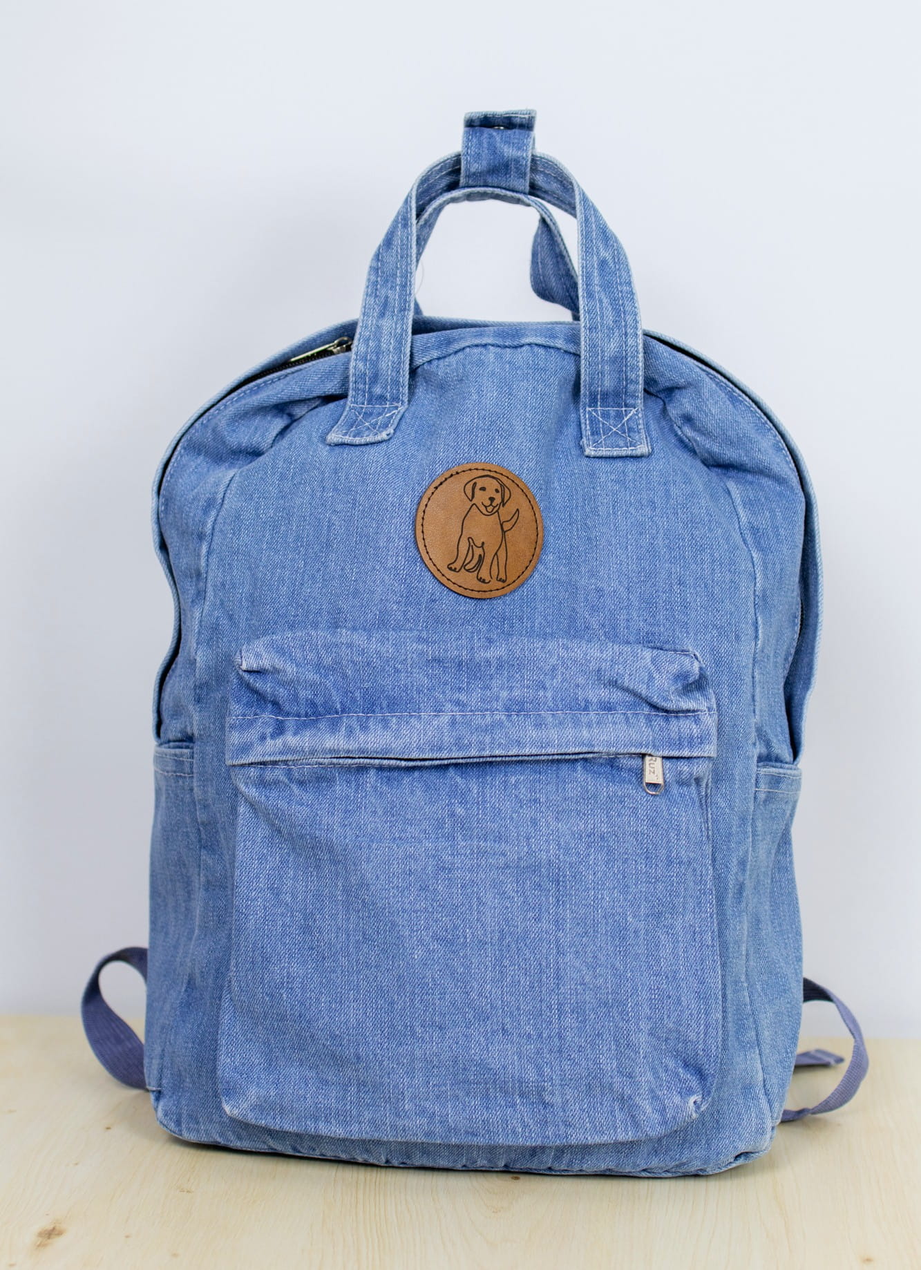 Jeansowy plecak zapinany na suwak z naszywką z grawerem laserowym LABRADOR.