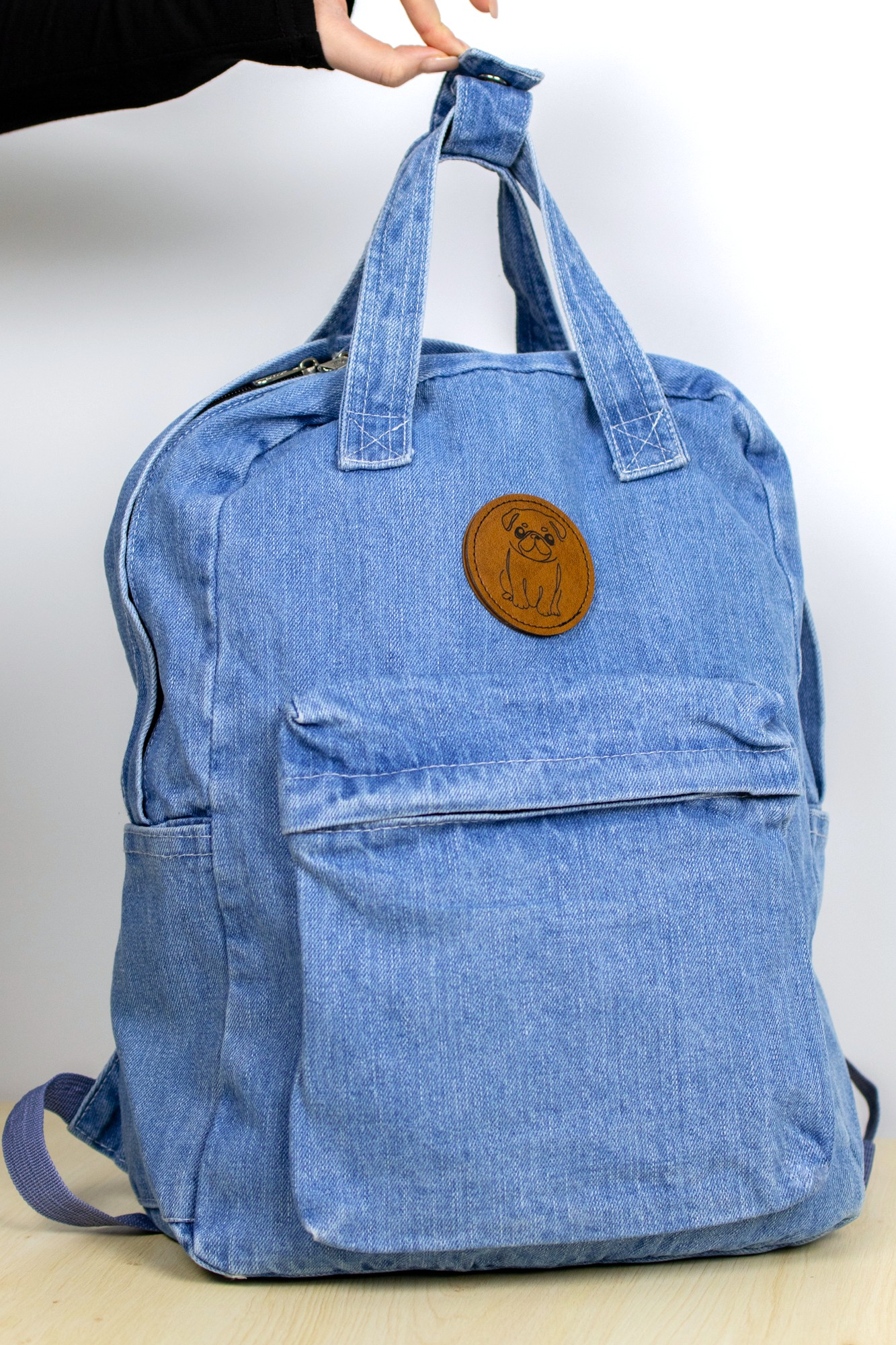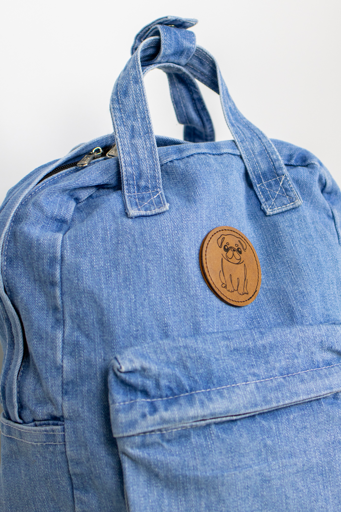 Jeansowy plecak zapinany na suwak z naszywką z grawerem laserowym MOPS.