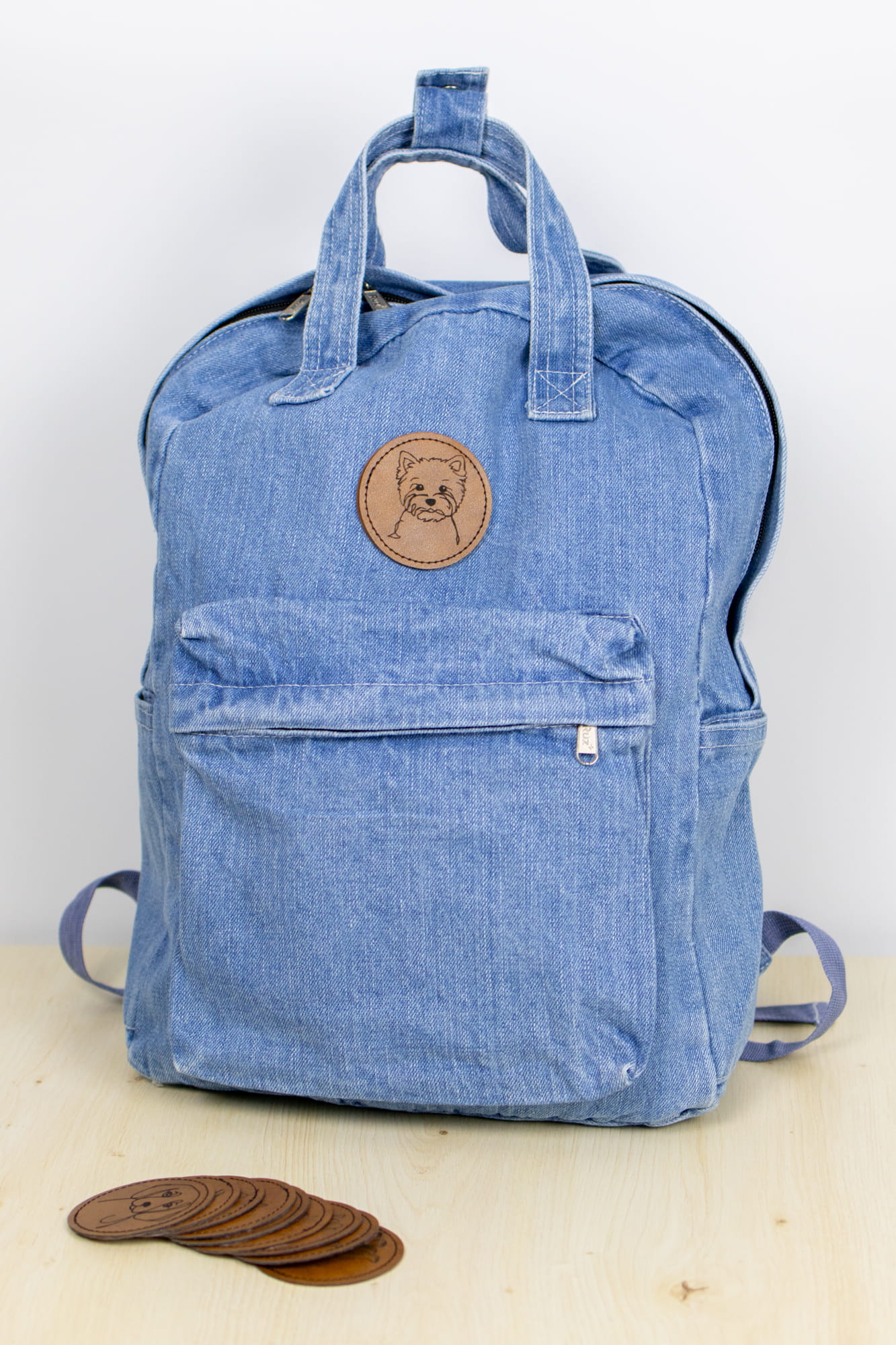 Jeansowy plecak zapinany na suwak z naszywką z grawerem laserowym WEST HIGHLAND.
