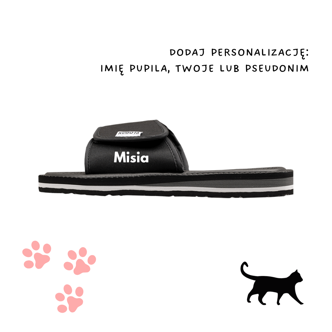Klapki dla właścicieli kotków, którzy lubią widzieć swojego ulubieńca również na swoich Kubotach. Po bokach umieszczamy imię kota albo jakiś pseudonim, którym się do niego pieszczotliwie zwracasz (wpisz w okienku powyżej, jakie imię mamy tam umieścić). A potem Ty wskakujesz w dresik, skarpety i swoje piękne kocie klapki. I żyli długo i szczęśliwie. THE END.