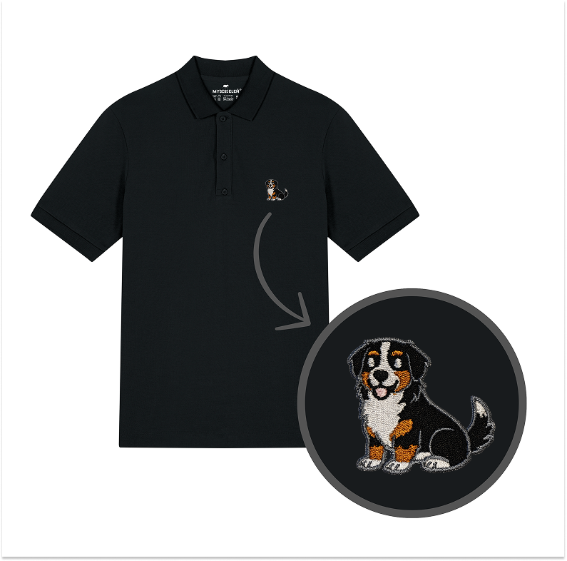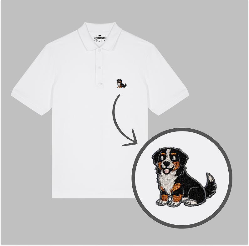 Męska koszulka polo premium z haftem BERNEŃSKI PIES PASTERSKI na piersi.