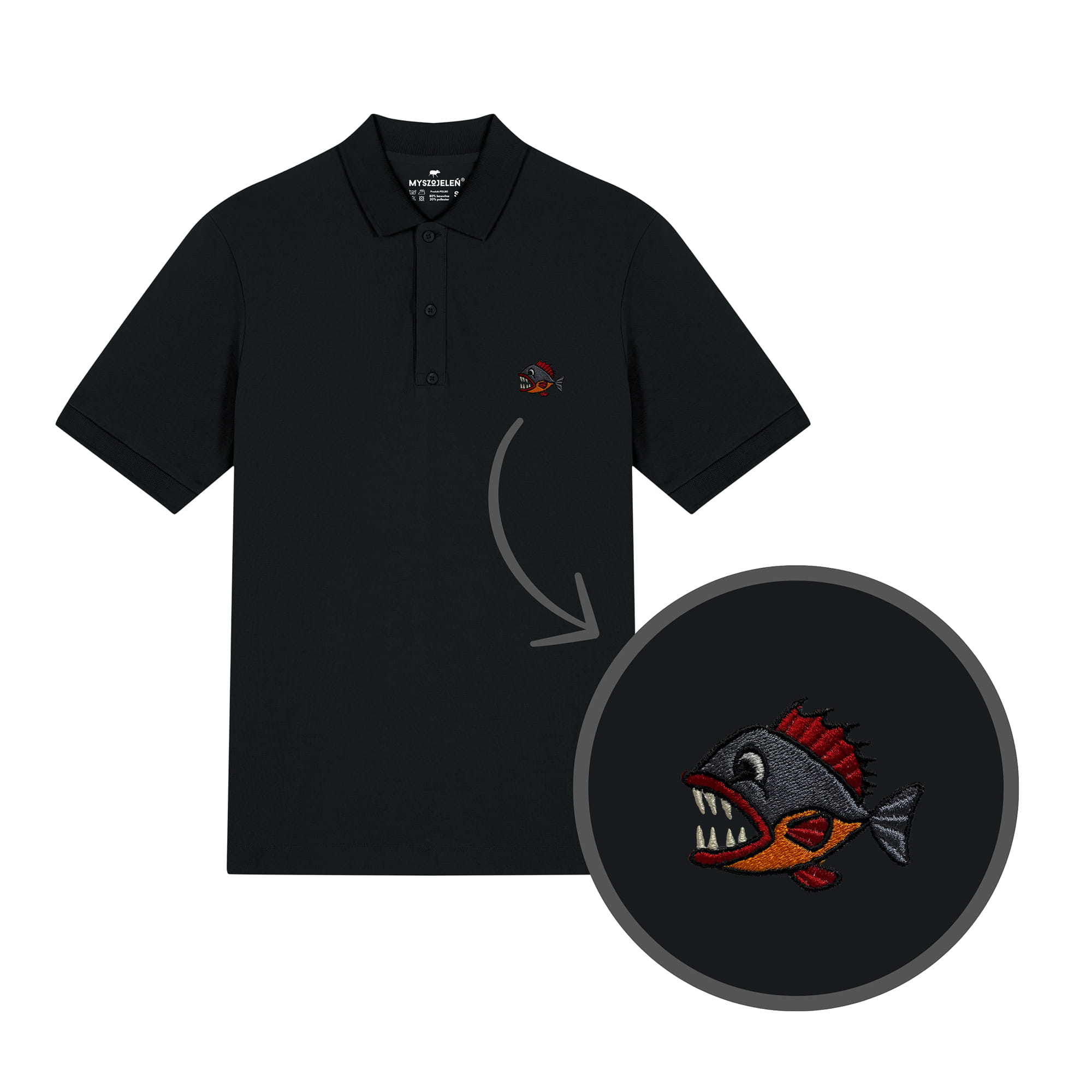 Męska koszulka polo premium z haftem PIRANIA na piersi.