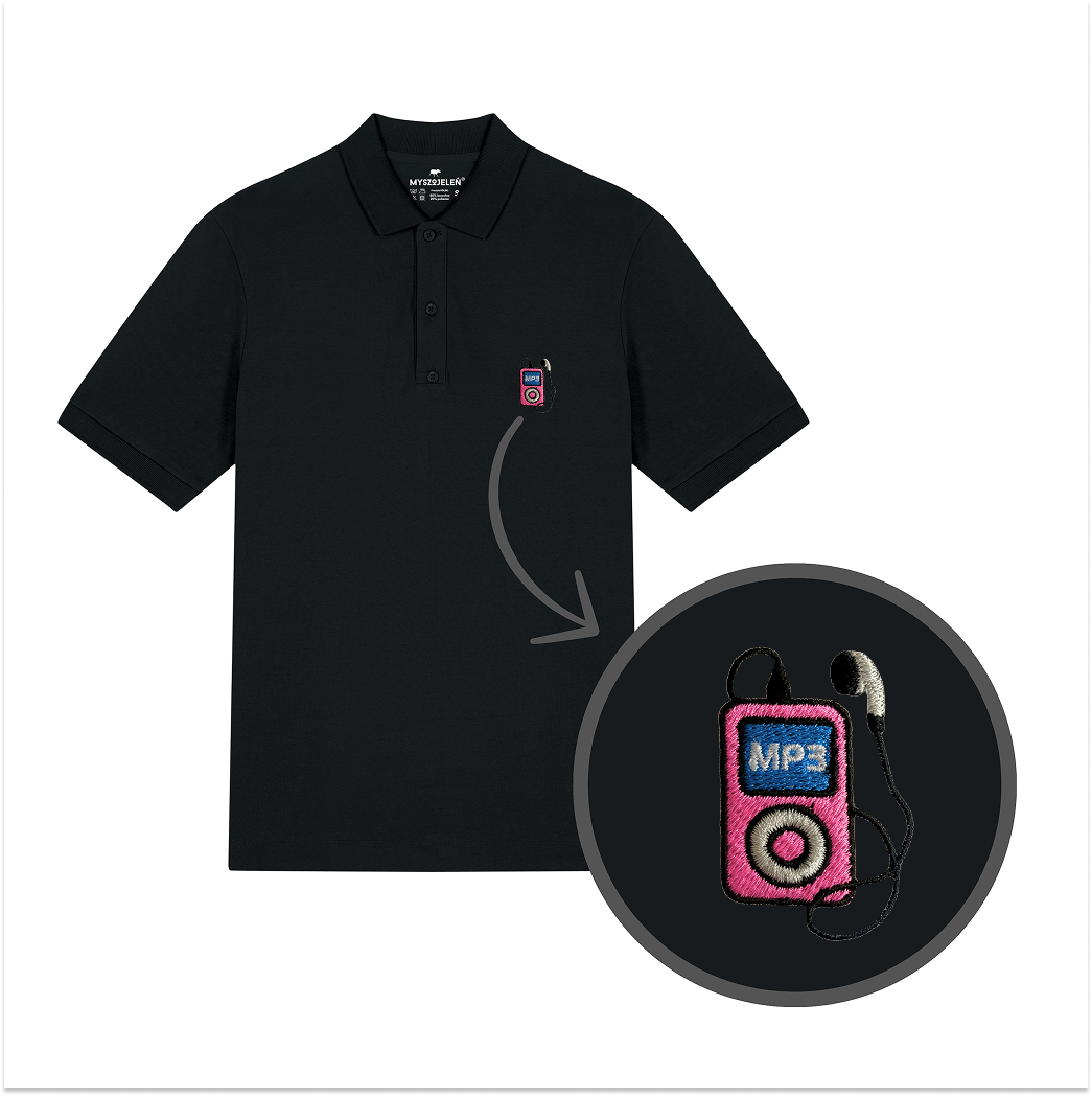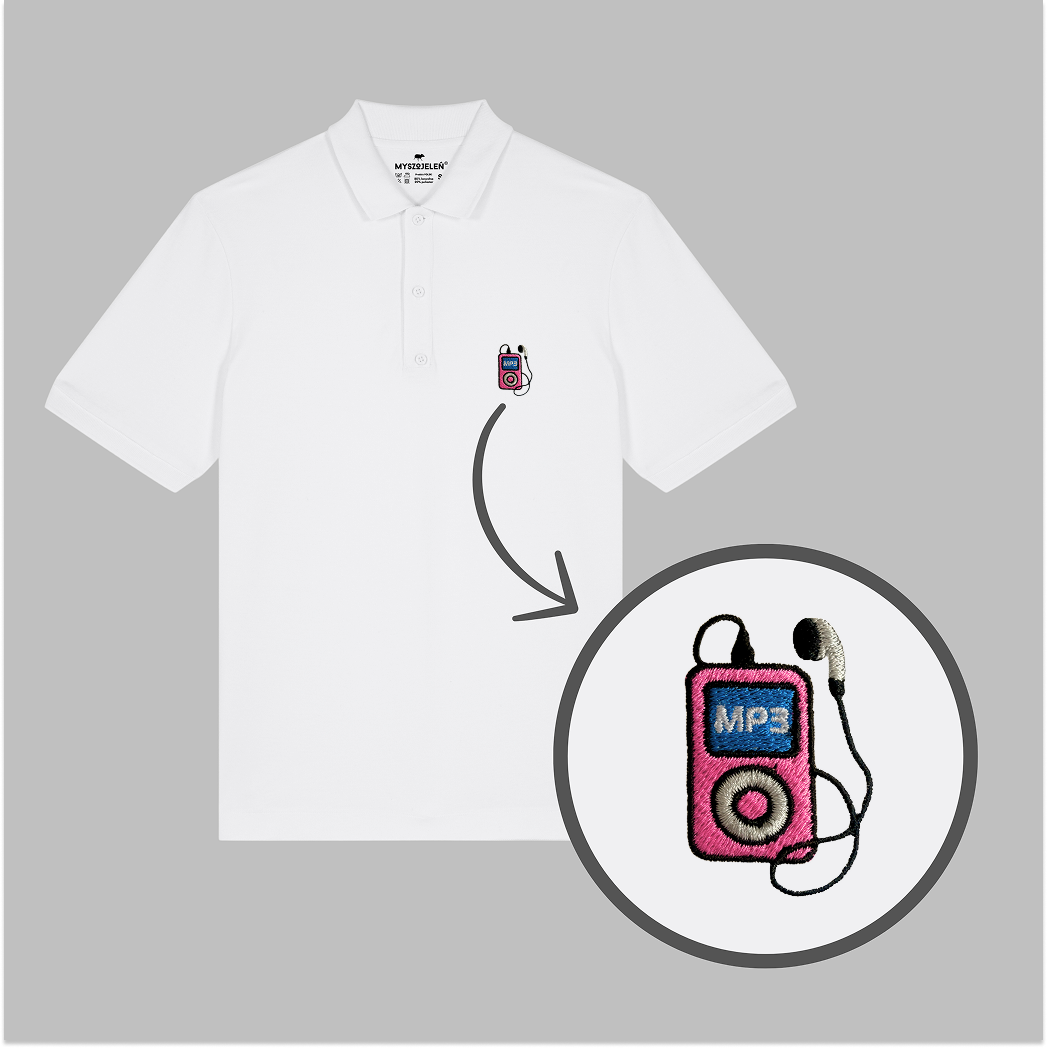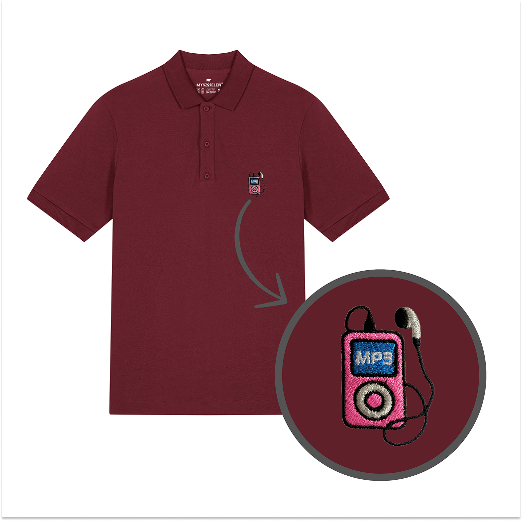 Męska koszulka polo premium z haftem RÓŻOWY ODTWARZACZ MP3 na piersi.