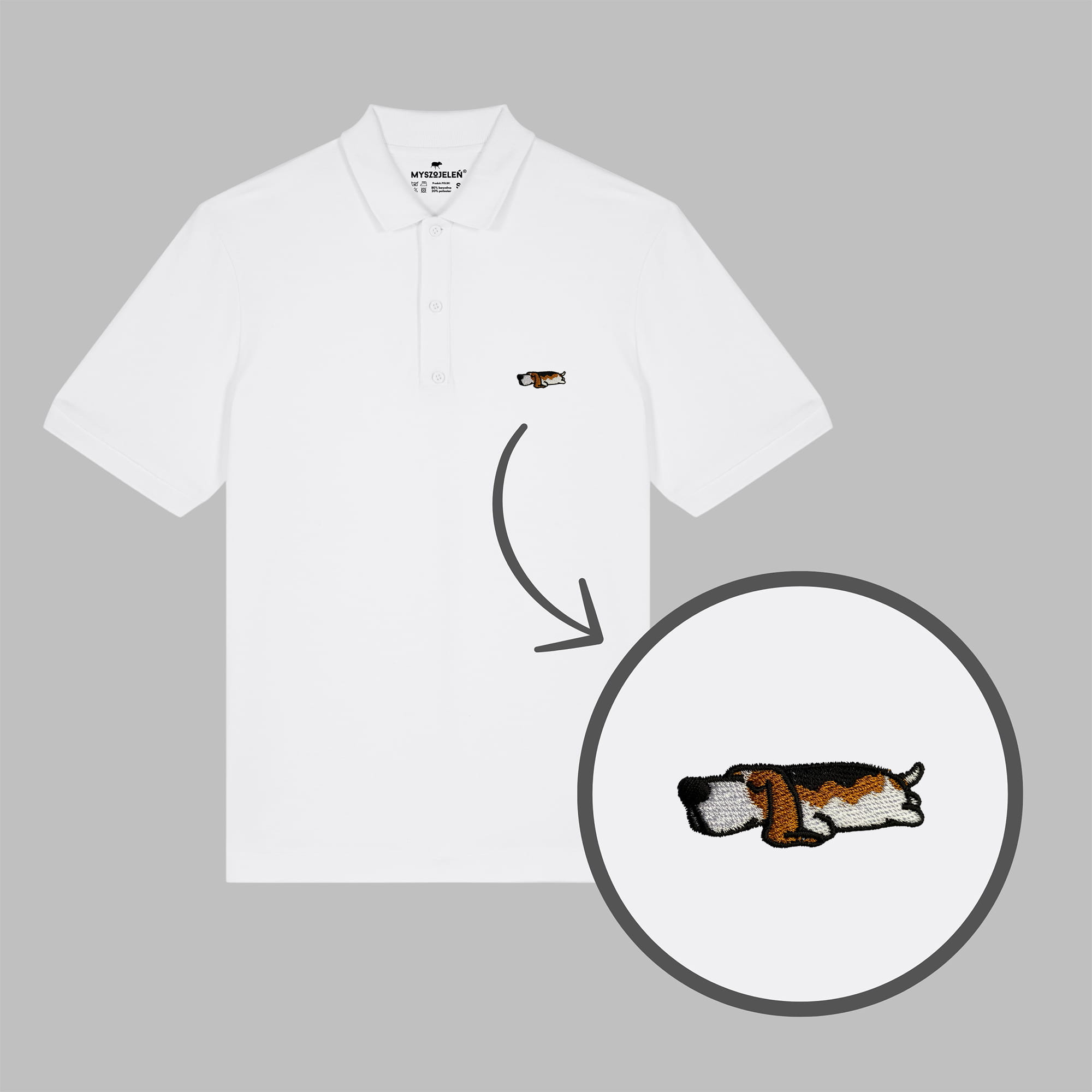 Męska koszulka polo premium z haftem ŚPIĄCY BASSET na piersi.