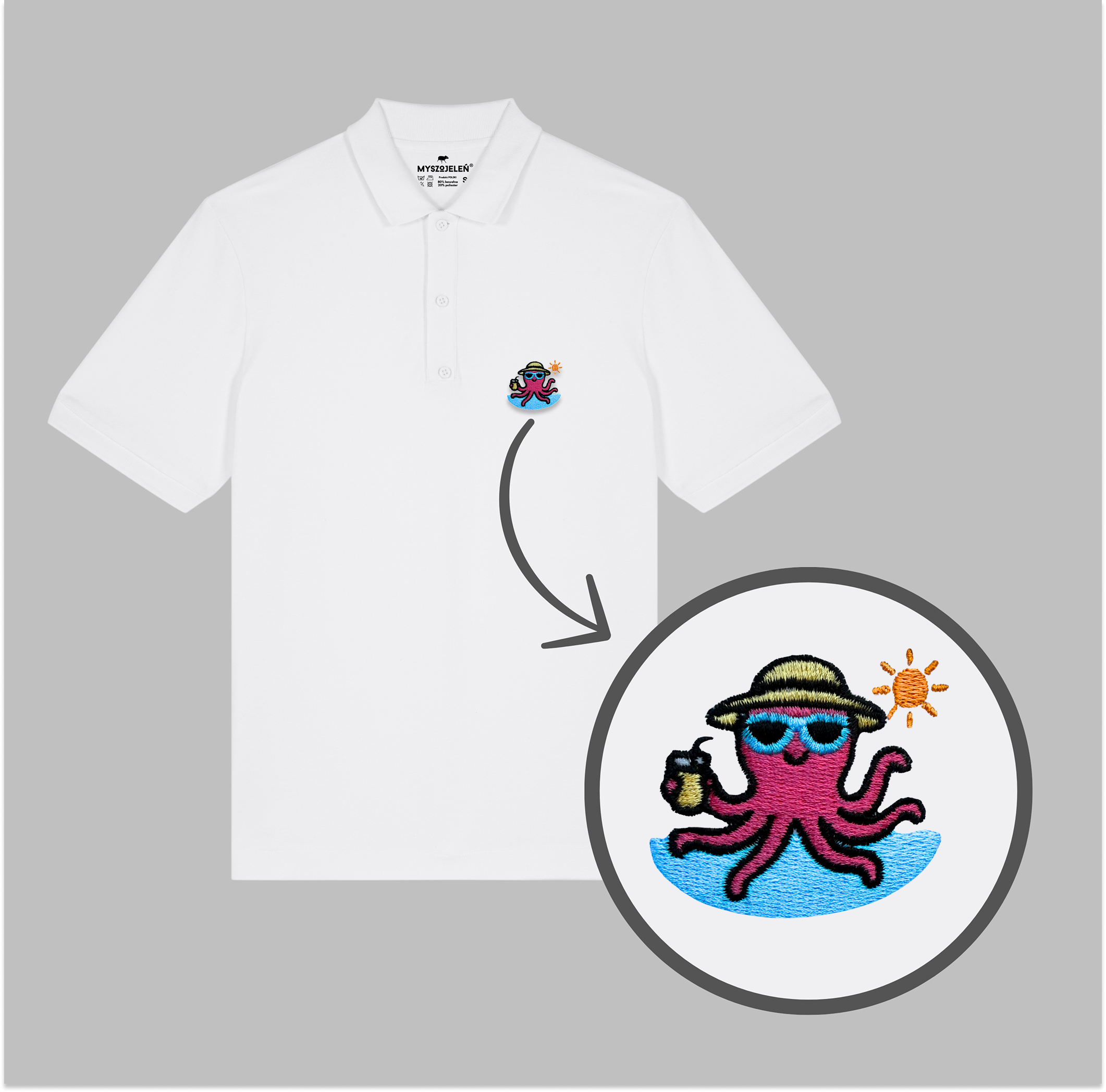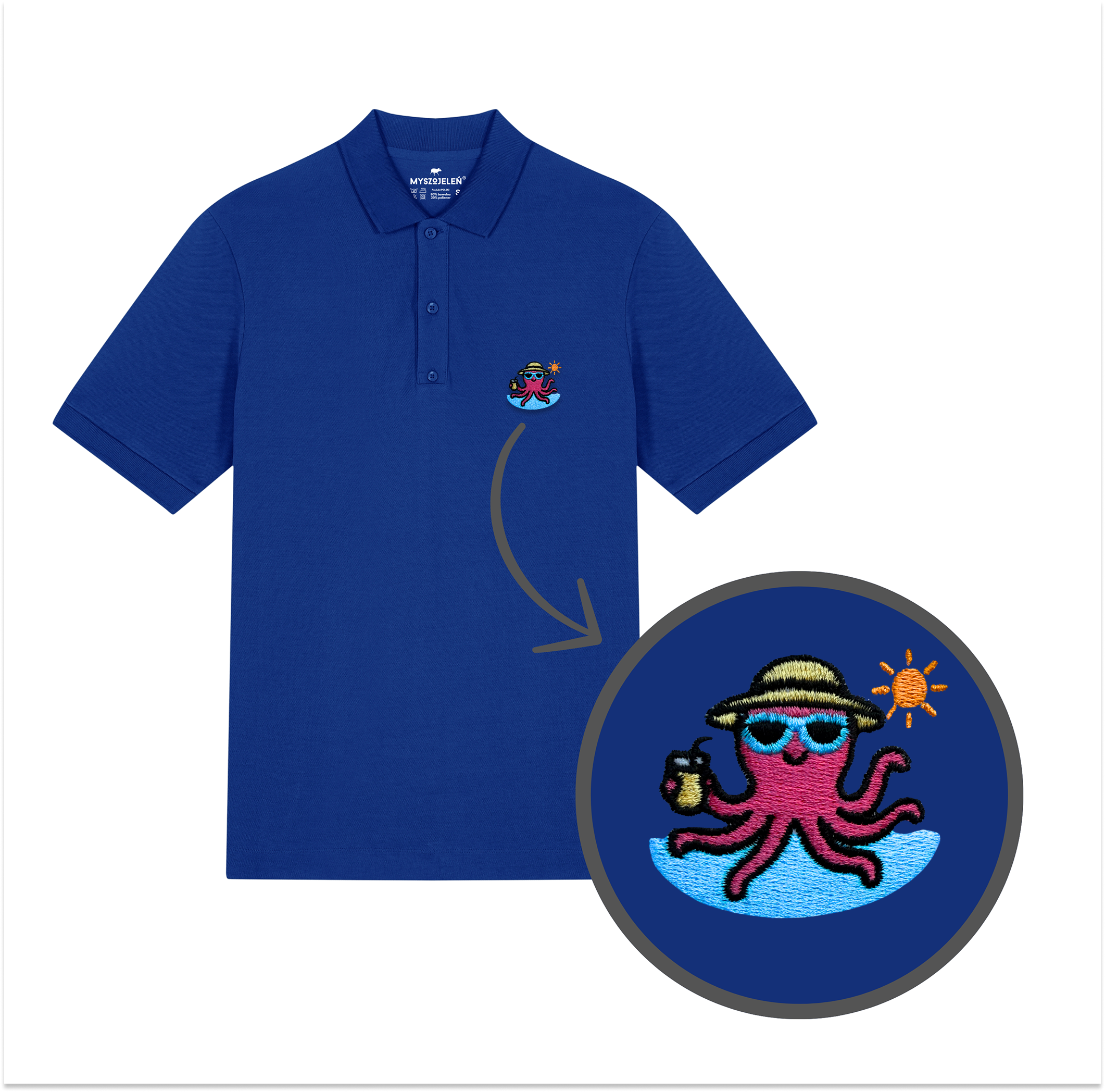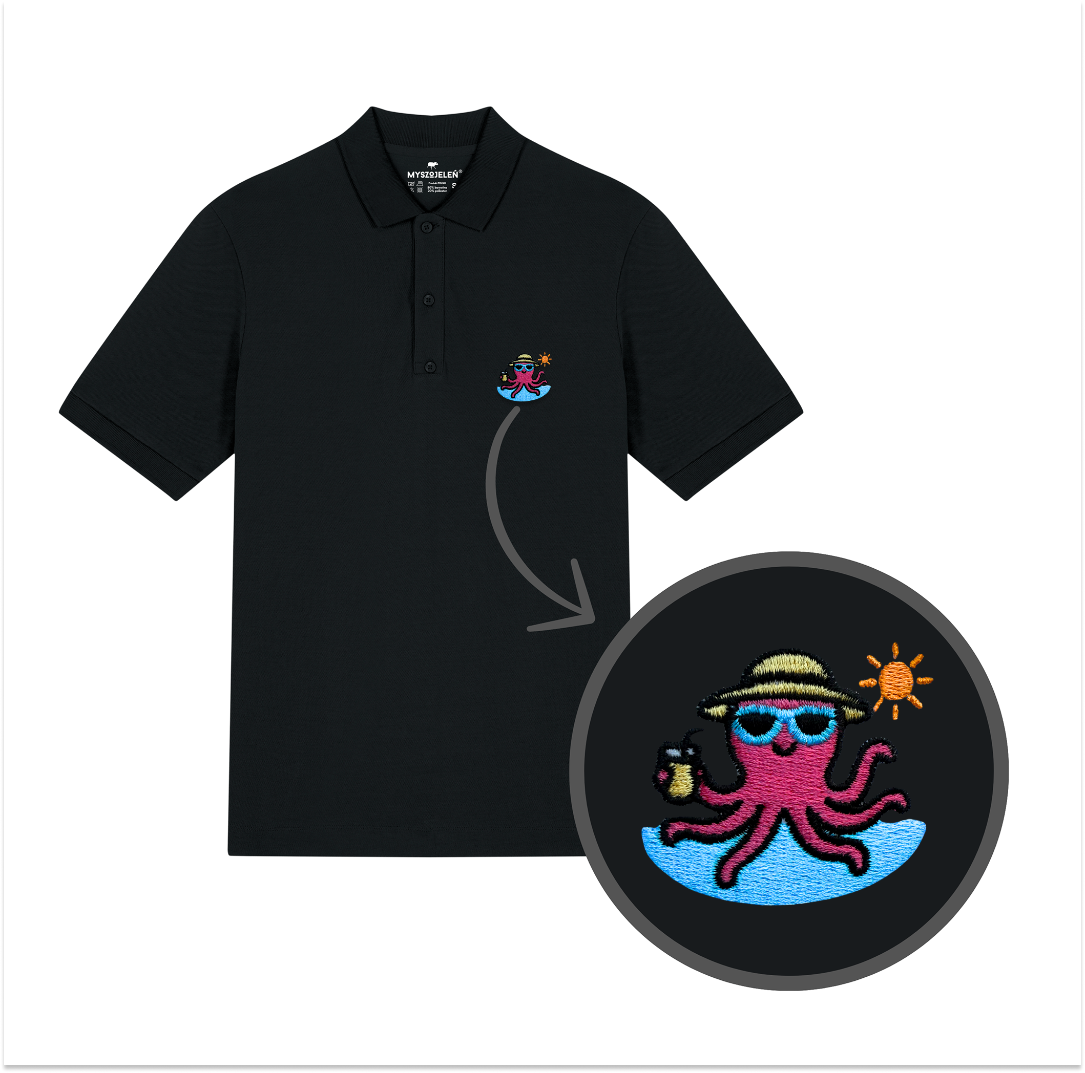 Męska koszulka polo premium z haftem WAKACYJNA OŚMIORNICA na piersi.