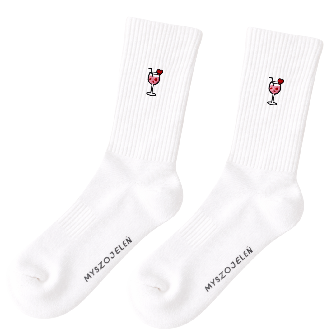 Długie bawełniane skarpetki z wyhaftowanym DRINKIEM w kolorze białym lub kremowym.