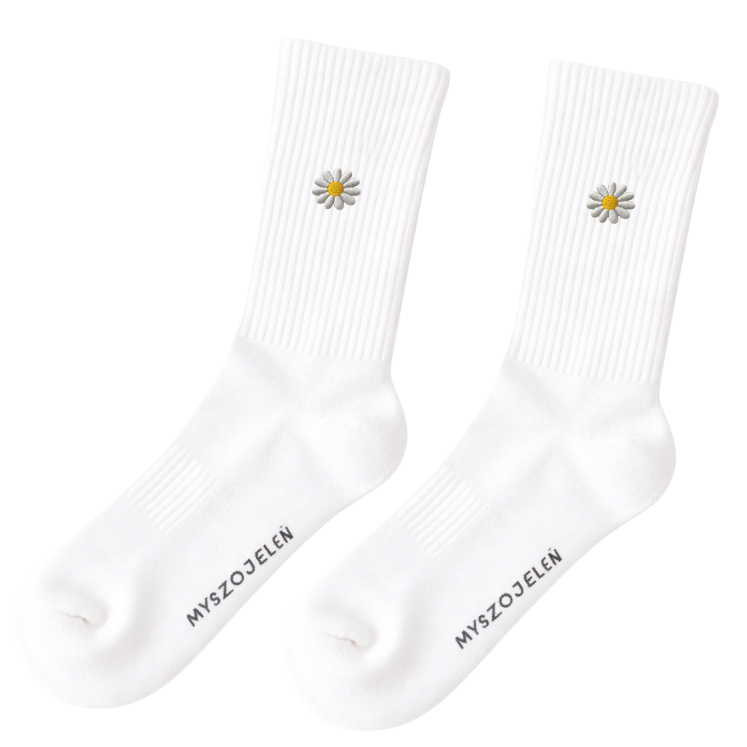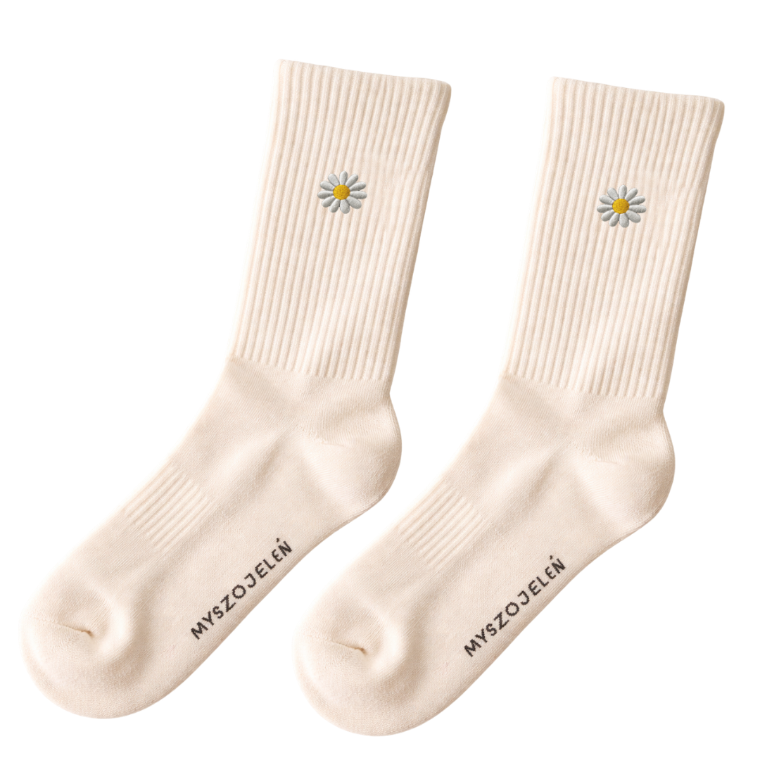 Długie bawełniane skarpetki z wyhaftowaną STOKROTKĄ w kolorze białym lub kremowym.