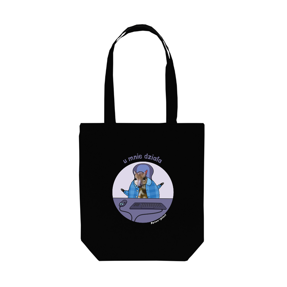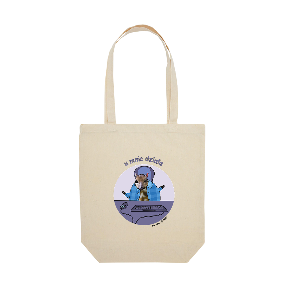Eko torba na zakupy Myszojeleń INFORMATYK, czyli idealny produkt, którym zastąpisz reklamówkę z biedry robiąc zakupy, ale też z powodzeniem zastąpisz nią torebkę albo schowasz w niej ważne dokumenty. A jak będzie akurat pusta, a Ty będziesz czekać na tramwaj jesienią na zimnym przystanku, to możesz sobie na niej usiąść i będzie miękko. No sto zastosowań, albo wiecej!